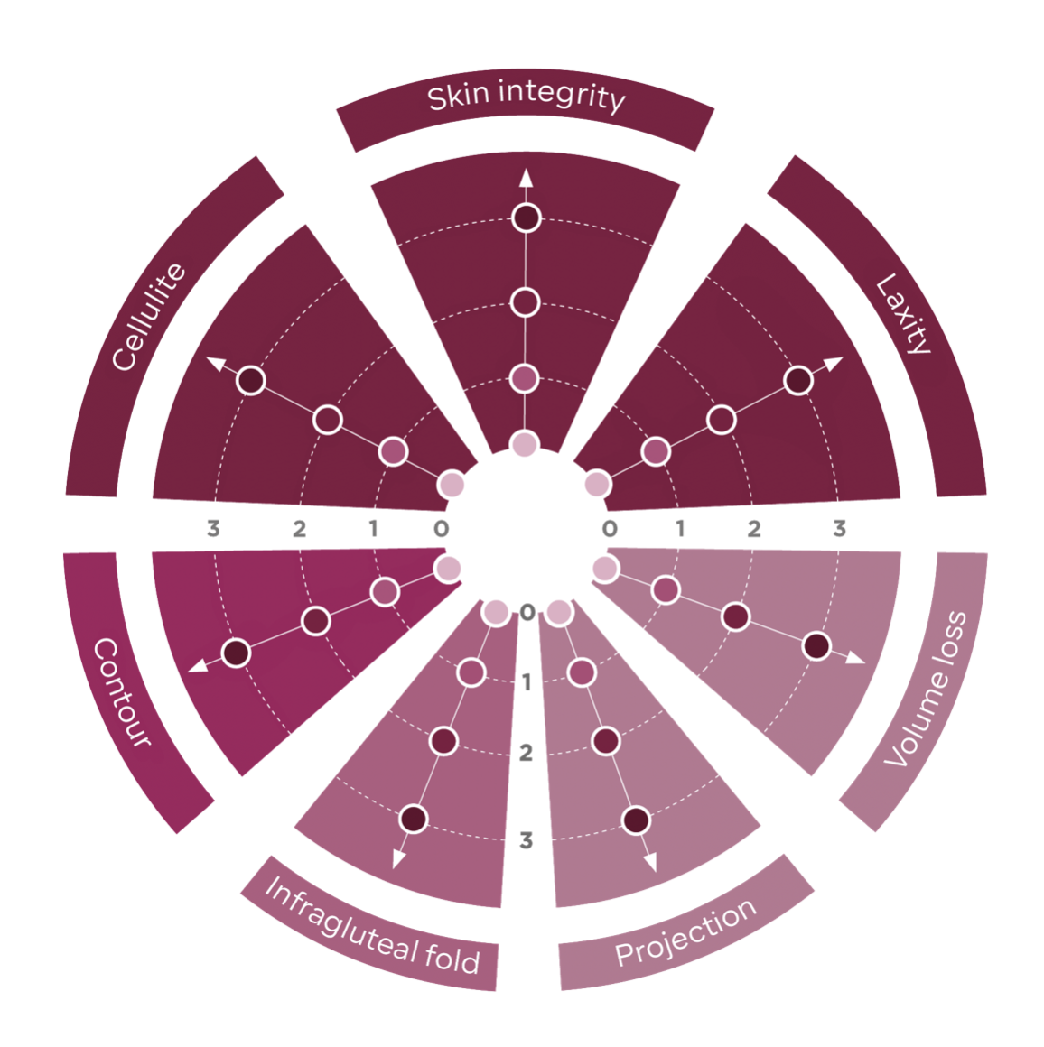During your butt lift consultation, Dr. Lee uses the Galderma Gluteal Assessment Scale, which objectively measures volume, projection, contour, and tissue firmness.